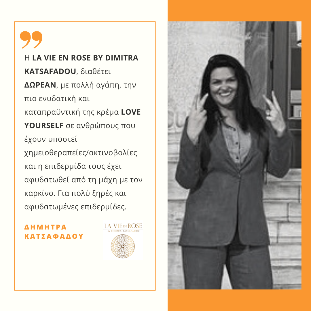 Δωρεάν και με πολλή αγάπη αποφάσισε να προσφέρει την πιο ενυδατική και καταπραϋντική της κρέμα LOVE YOURSELF σε ανθρώπους που έχουν υποστεί χημειοθεραπείες, ακτινοβολίες, ή μαστεκτομή και η επιδερμίδα τους έχει αφυδατωθεί και πληγεί από τη μάχη με τον καρκίνο. Μαζί θα επουλώσουμε τα σημάδια και θα ανανεώσουμε την ψυχολογία μας!